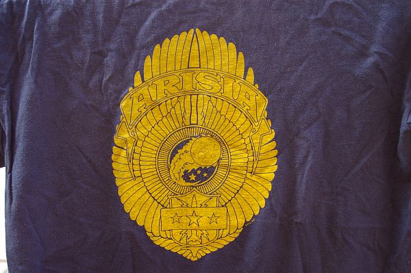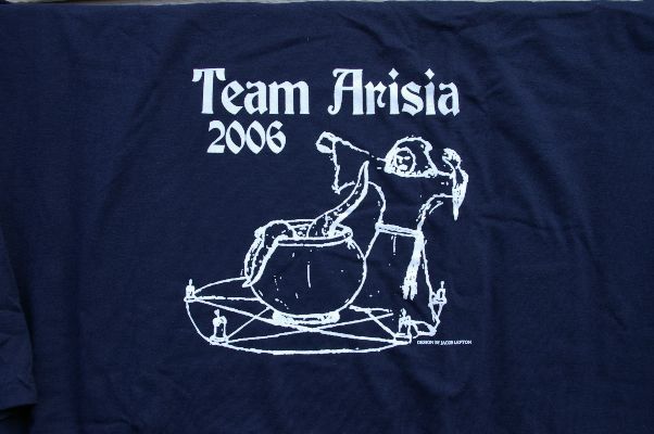 | 12. A'95, planned to be the volunteer shirt. However every shirt had the 'Arisia Special Teams' printed on back instead of only a run of 25. So the red shirt was given to sales and blue to volunteers. Didn't sell very well. Artist Jael. (A95Team.jpg, A95TeamBack.jpg) |