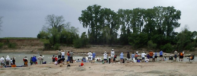 The put-in consists of a long slide down a steep bank to the river. The put-in was also the finish line for a 28-mile downriver race held during festival. |